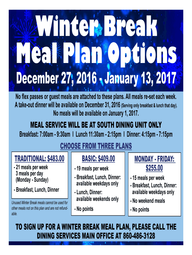 December 27, 2016, January 13, 2017No flex passes or guest meals are attached to these plans. All meals reset each week.