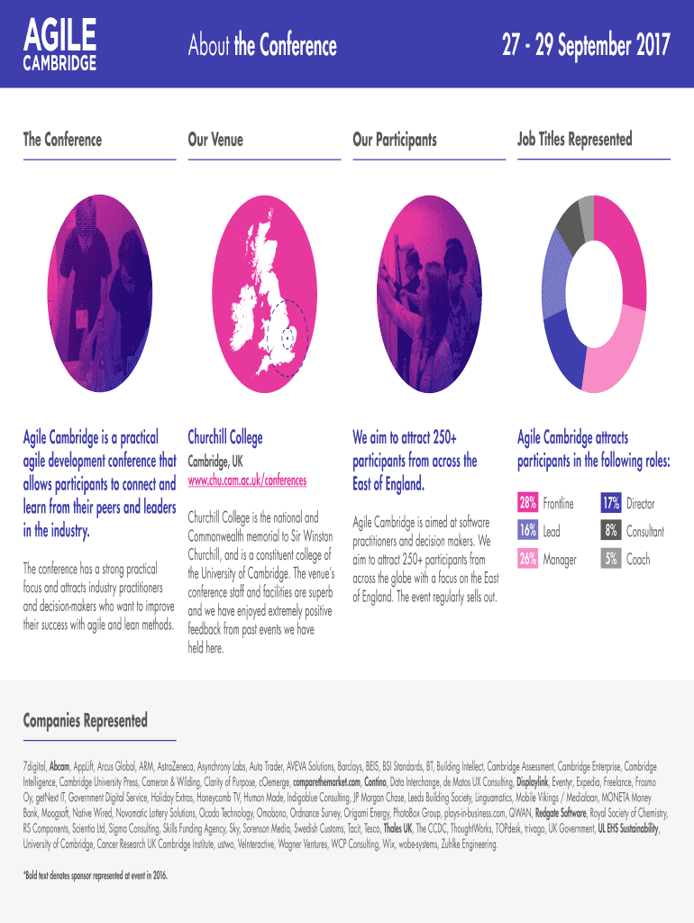 About the Conference27 29 September 2017The Conference Venue Participants Job Titles RepresentedAgile Cambridge is a practical agile development conference that allows participants to connect and