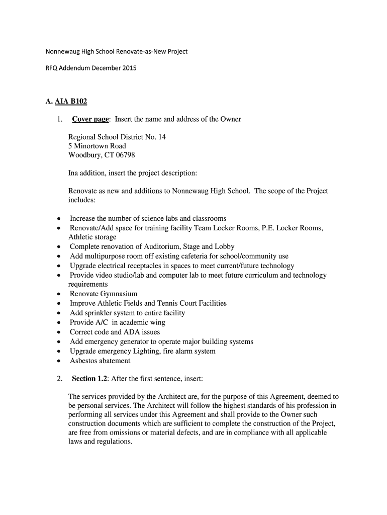 Nonnewaug High School RenovateasNew Project RFQ Addendum December 2015A. AIR B102 1. Cover page: Insert the name and address of the Owner Regional School District No. 14 5 Minor town Road Woodbury,