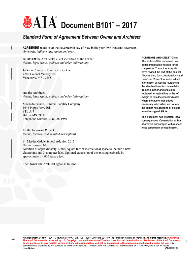Document B101 2017 Standard Form of Agreement Between Owner and Architect AGREEMENT made as of the Seventeenth day of May in the year Two thousand seventeen (In words, indicate day, month and year.)