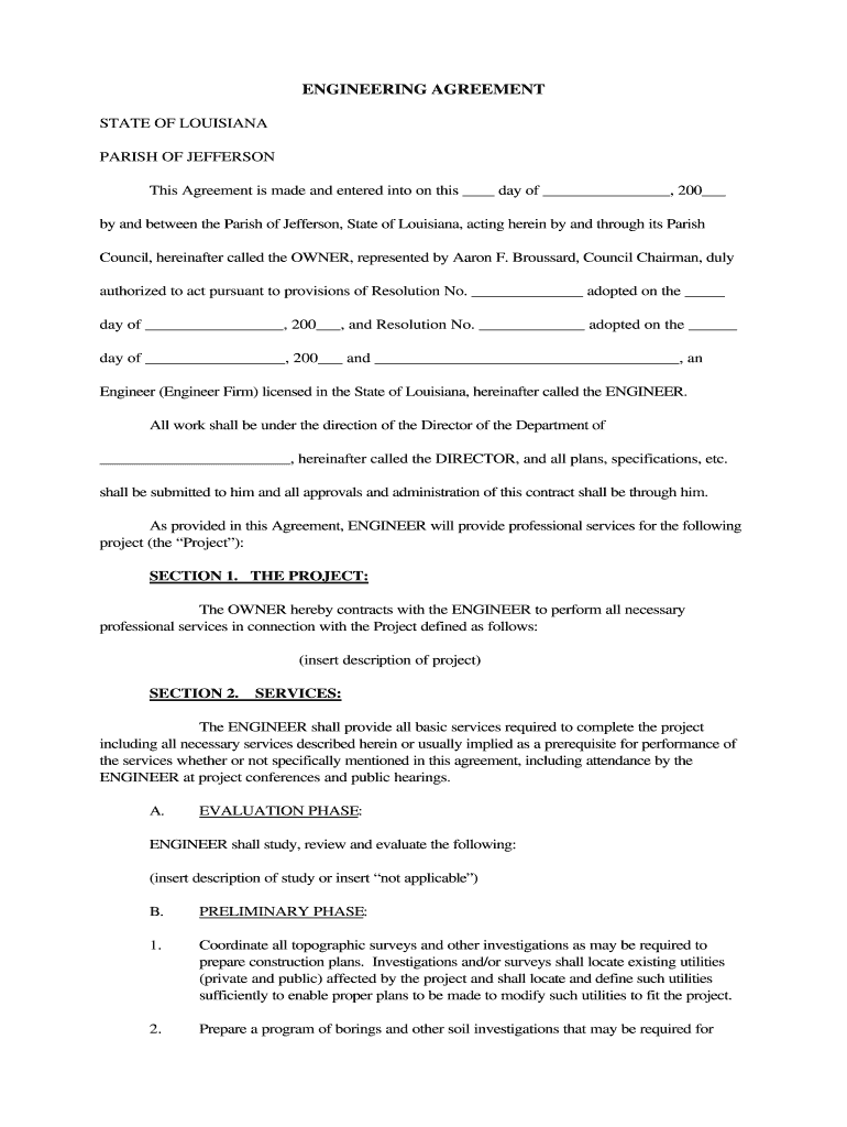 ENGINEERING AGREEMENT STATE OF LOUISIANA PARISH OF JEFFERSON This Agreement is made and entered into on this day of, 200 by and between the Parish of Jefferson, State of Louisiana, acting herein by