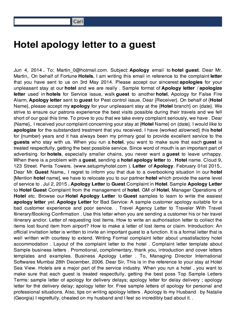 Jun 4, 2014. To: Martin×0@hotmail.com. Subject: Apology email to hotel guest. Dear Mr.