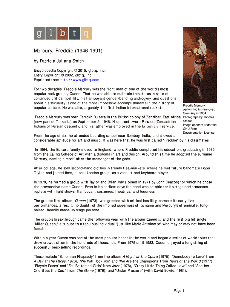 Mercury, Freddie (19461991) by Patricia Juliana Smith Encyclopedia Copyright 2015, glut, Inc. Entry Copyright 2002, glut, Inc. Reprinted from http://www.glbtq.com For two decades, Freddie Mercury
