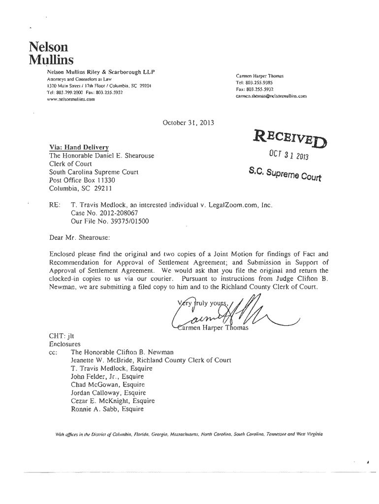 Nelson Mullins Riley & Scarborough LLP Attorneys and Counselors at Law 1310 Main Street I NIH Floor I Columbia, SC 19101 Tel: 803.799.2(0) Fax, 803.255.5931 www.neJsonmuIJins.comCannen Harper Thomas