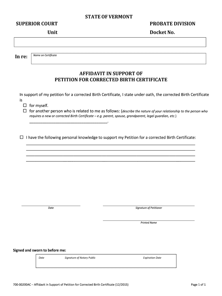 STATE OF VERMONT SUPERIOR COURTPROBATE DIVISIONUnitIn re:Docket No. Name on CertificateAFFIDAVIT IN SUPPORT OF PETITION FOR CORRECTED BIRTH CERTIFICATE In support of my petition for a corrected Birth
