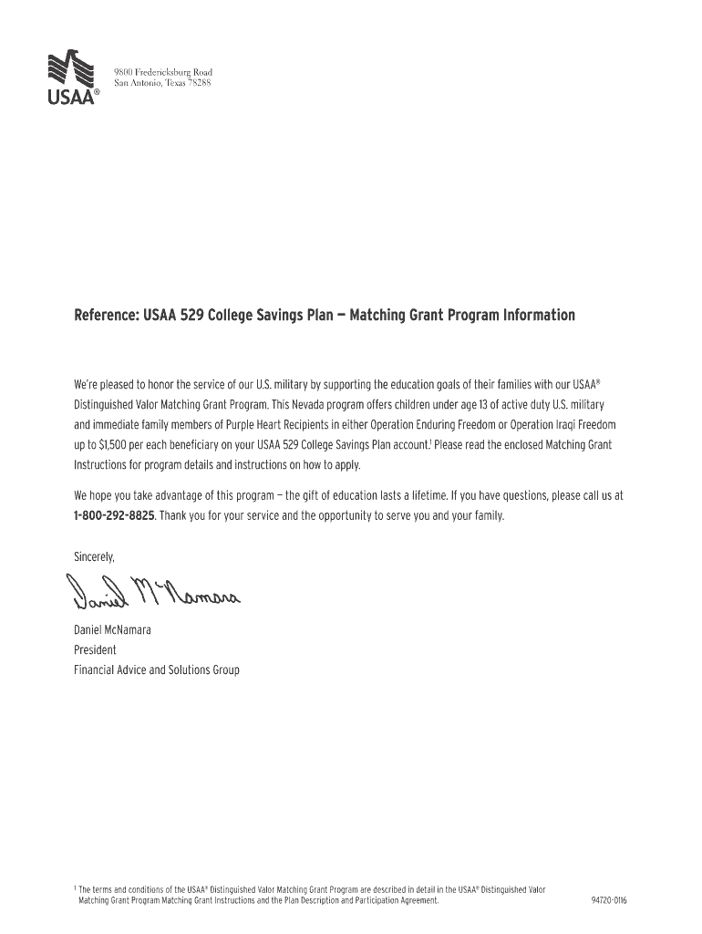 9800 Fredericksburg Road San Antonio, Texas 78288Reference: USA 529 College Savings Plan Matching Grant Program Informational pleased to honor the service of our U.S. military by supporting the education