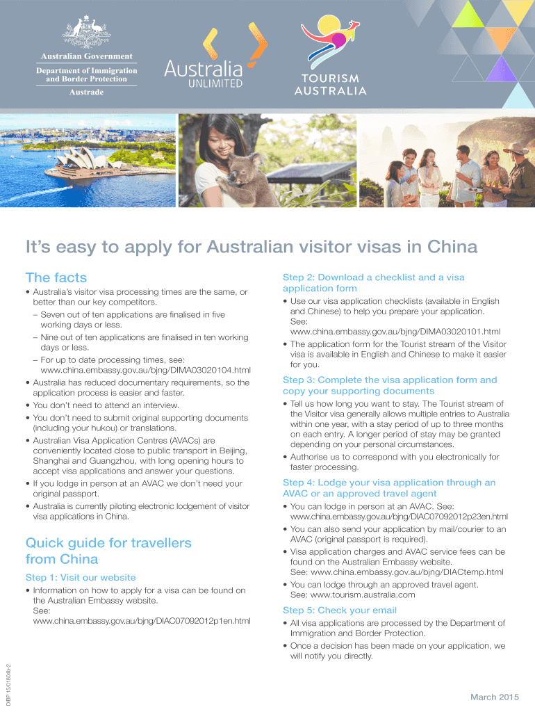 It's easy to apply for Australian visitor visas in China The facts Australia's visitor visa processing times are the same, or better than our key competitors. Seven out of ten applications are finalized