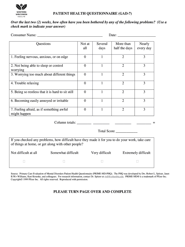 Get the free PATIENT HEALTH QUESTIONNAIRE (GAD-7)