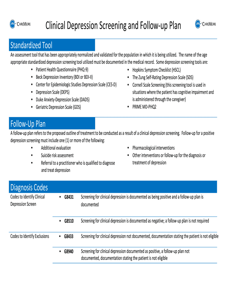 Clinical Depression Screening and Followup Plan Standardized Tools assessment tool that has been appropriately normalized and validated for the population in which it is being utilized. The name of