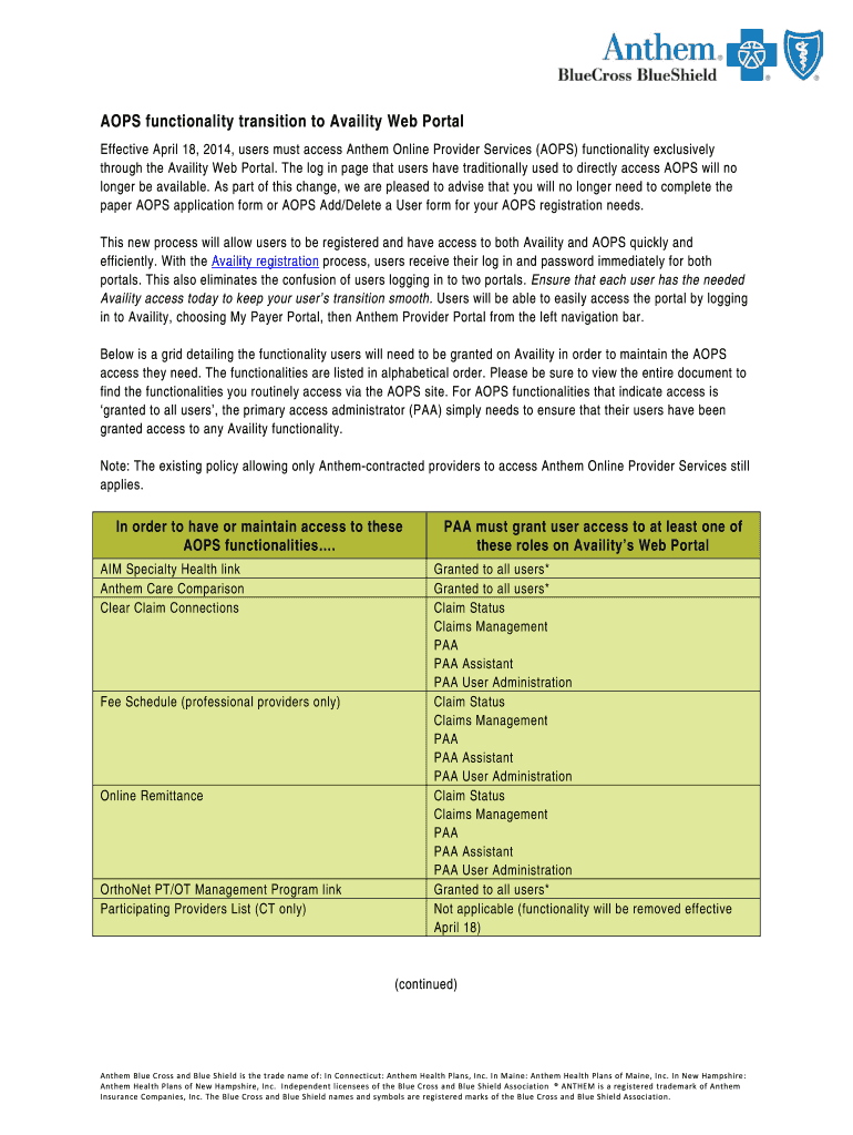 Effective April 18, 2014, users must access Anthem Online Provider Services (TOPS) functionality exclusively
