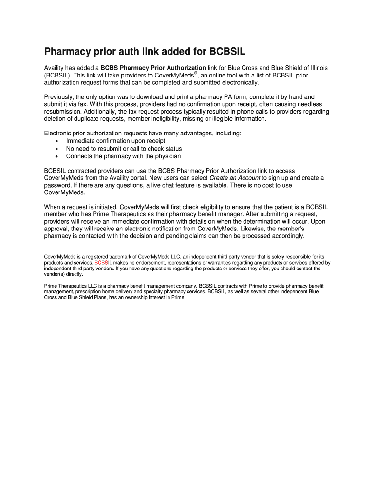 Pharmacy prior auth link added for BCB SIL Ability has added a BCBS Pharmacy Prior Authorization link for Blue Cross and Blue Shield of Illinois (BCB SIL). This link will take providers to CoverMyMeds,
