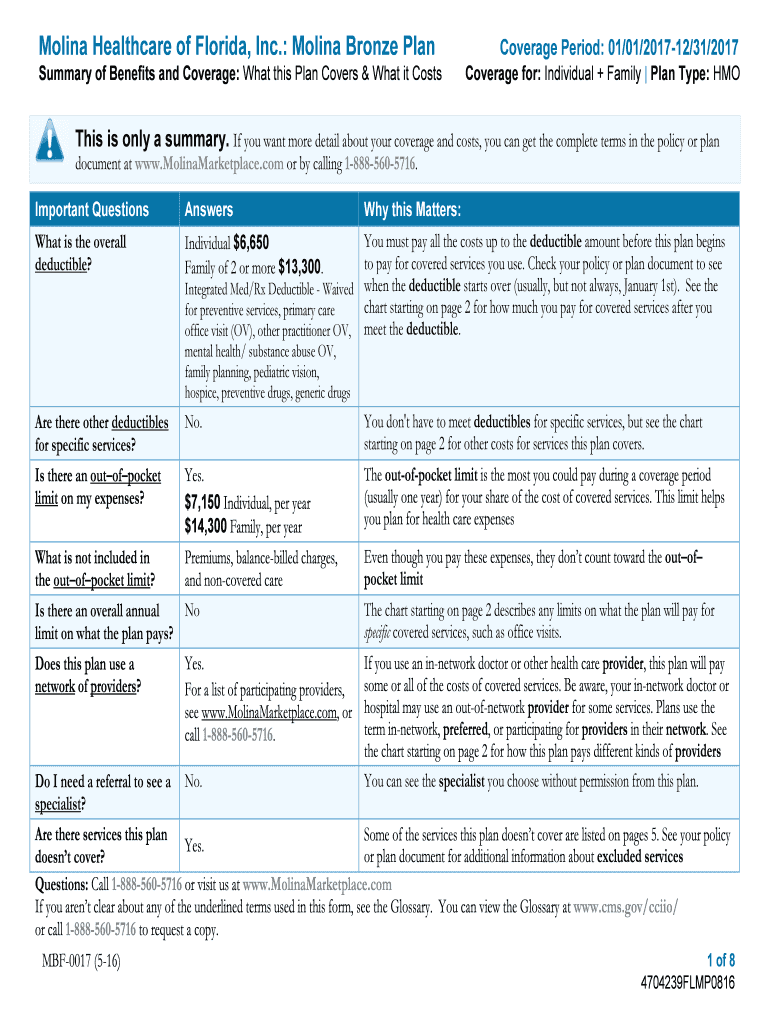 Molina Healthcare of Florida, Inc.: Molina Bronze PlanSummary of Benefits and Coverage: What this Plan Covers & What it CostsCoverage Period: 01/01/201712/31/2017Coverage for: Individual + Family