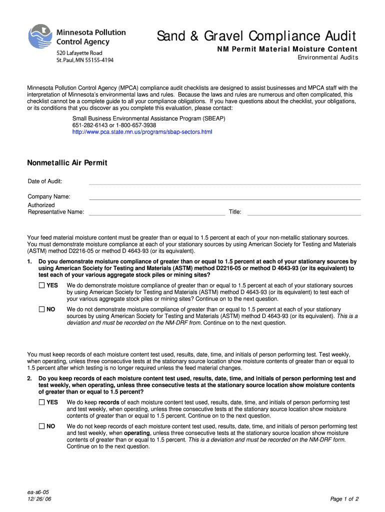 Sand & Gravel Compliance Audit NM Permit Material Moisture Content Environmental Audits Minnesota Pollution Control Agency (MPA) compliance audit checklists are designed to assist businesses and MPA