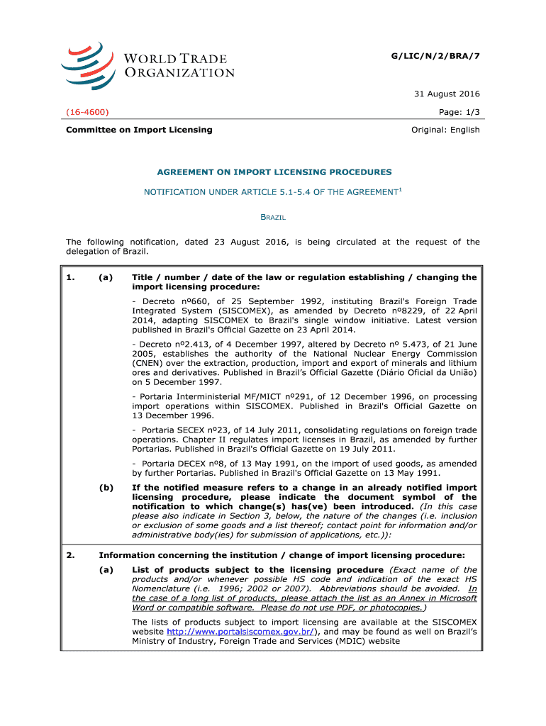 G/LIC/N/2/BRA/731 August 2016 (164600)Page: 1/3Committee on Import LicensingOriginal: EnglishAGREEMENT ON IMPORT LICENSING PROCEDURES NOTIFICATION UNDER ARTICLE 5.15.4 OF THE AGREEMENT1 BRAZIL The