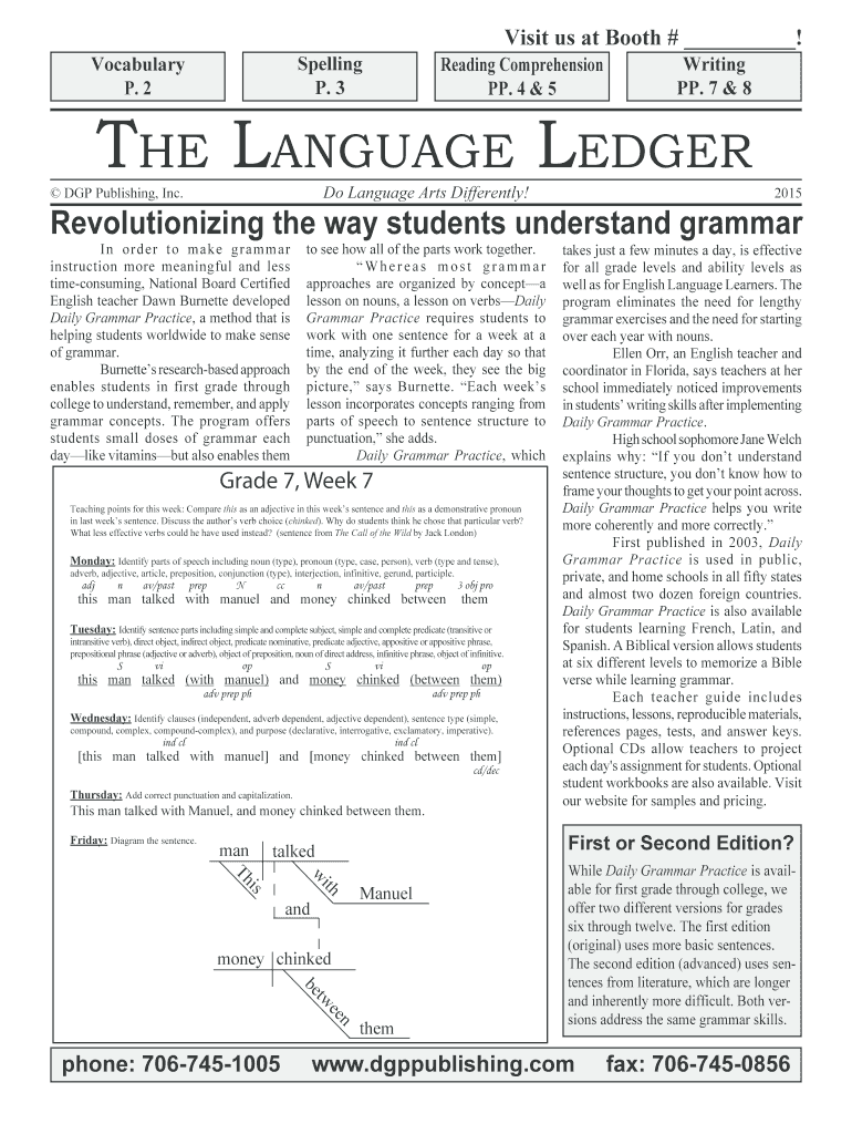 Visit us at Booth # ! Spelling P. 3Vocabulary P. 2Reading Comprehension PP. 4 & 5Writing PP. 7 & 8The Language Ledger Do Language Arts Differently! DGP Publishing, Inc.2015Revolutionizing the way