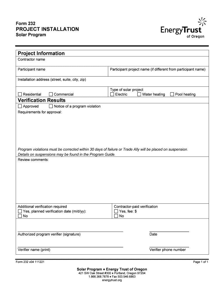 Form 232 PROJECT INSTALLATION Solar Program Project Information Contractor name Participant project name (if different from participant name) Installation address (street, suite, city, zip) Residential