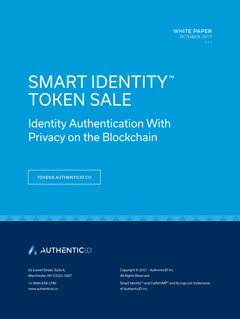 WHITE PAPER OCTOBER 2017 V 3.0SMART IDENTITY TOKEN SALEIdentity Authentication With Privacy on the BlockchainTOKENS.AUTHENTIC ID.CO62 Lowell Street, Suite 4,Copyright 2017 Authentic ID Inc. Manchester,