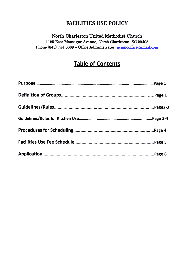 FACILITIES USE POLICY North Charleston United Methodist Church 1125 East Montague Avenue, North Charleston, SC 29405 Phone (843) 7446669 Office Administrator: ncumcoffice Gmail. Notable of Contents