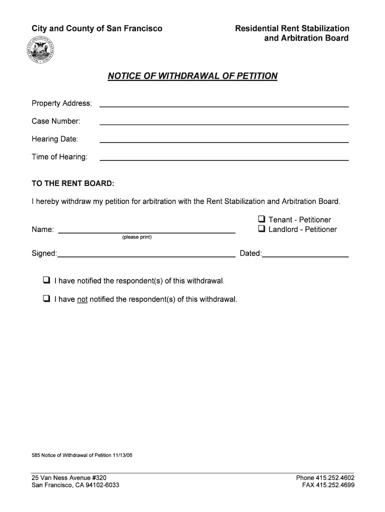 City and County of San FranciscoResidential Rent Stabilization and Arbitration BoardNOTICE OF WITHDRAWAL OF PETITION Property Address: Case Number: Hearing Date: Time of Hearing: TO THE RENT BOARD: