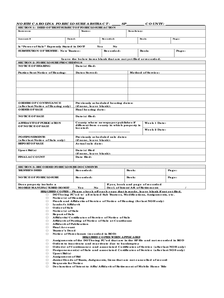 The North Carolina foreclosure abstract must be filled out with accurate information about the property and the foreclosure process.
