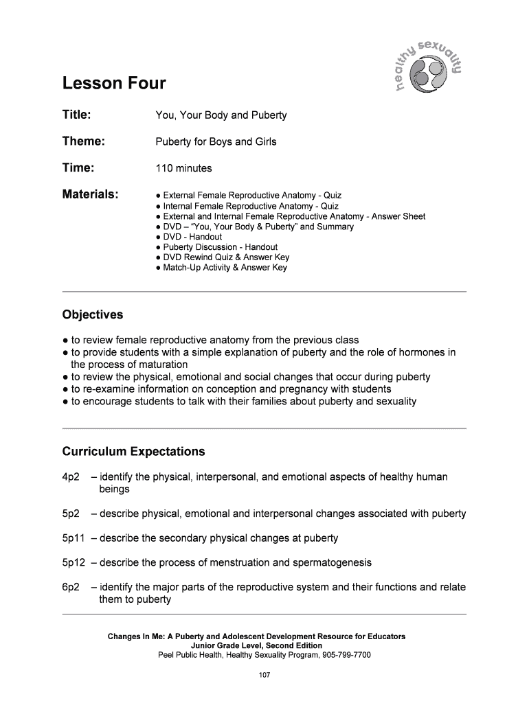 Lesson Four Title:You, Your Body and PubertyTheme:Puberty for Boys and Airtime:110 minutesMaterials: External Female Reproductive Anatomy Quiz Internal Female Reproductive Anatomy Quiz External and