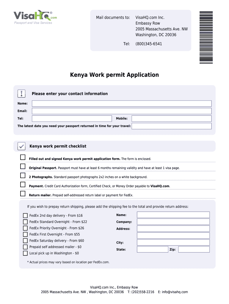 Obtain the Kenya work permit application form from the Kenyan Department of Immigration website.