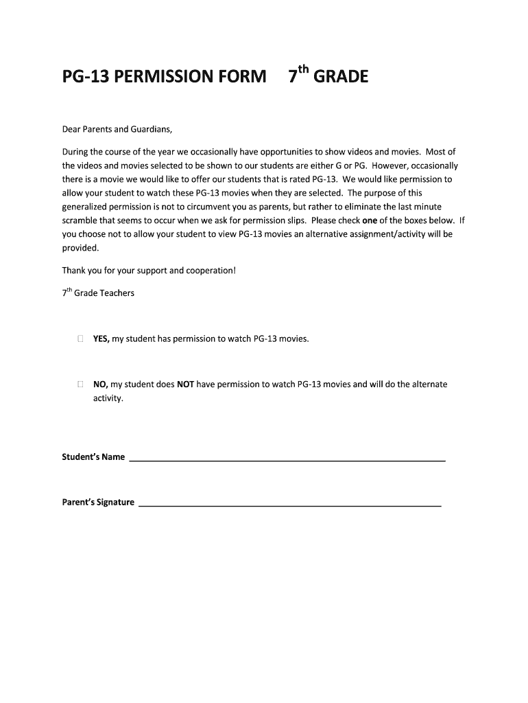 PG13 PERMISSION FORM7th GRADED ear Parents and Guardians,