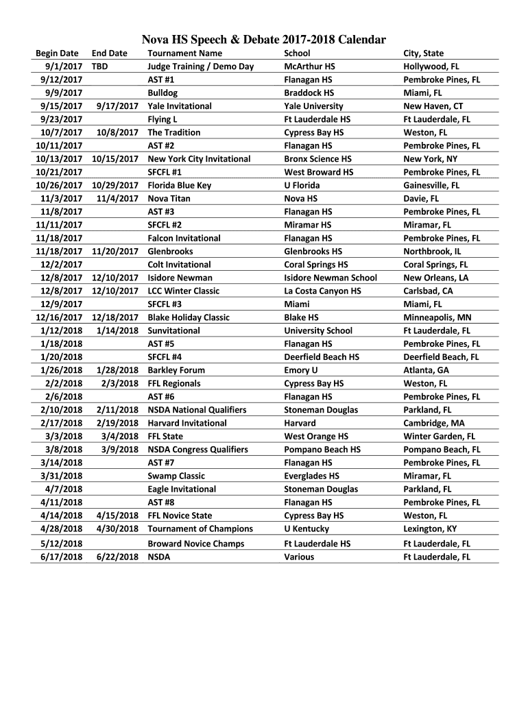 Nova HS Speech & Debate 20172018 Calendar Begin Date 9/1/2017 9/12/2017 9/9/2017 9/15/2017 9/23/2017 10/7/2017 10/11/2017 10/13/2017 10/21/2017 10/26/2017 11/3/2017 11/8/2017 11/11/2017 11/18/2017