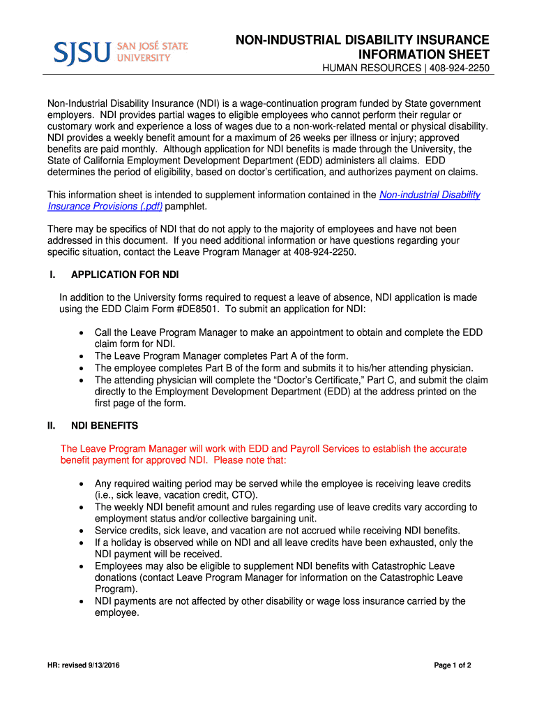 NONINDUSTRIAL DISABILITY INSURANCE INFORMATION SHEET HUMAN RESOURCES 4089242250NonIndustrial Disability Insurance (TDI) is a wage continuation program funded by State government employers. TDI provides