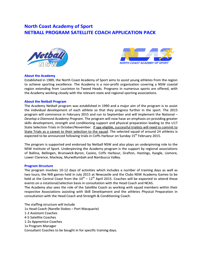 Get the free NETBALL PROGRAM SATELLITE COACH APPLICATION PACK