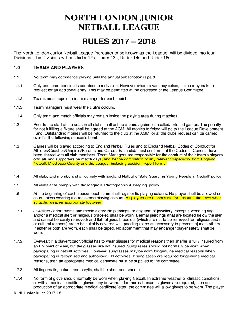 NORTH LONDON JUNIOR NETBALL LEAGUE RULES 2017 2018 The North London Junior Netball League (hereafter to be known as the League) will be divided into four Divisions. The Divisions will be Under 12s,