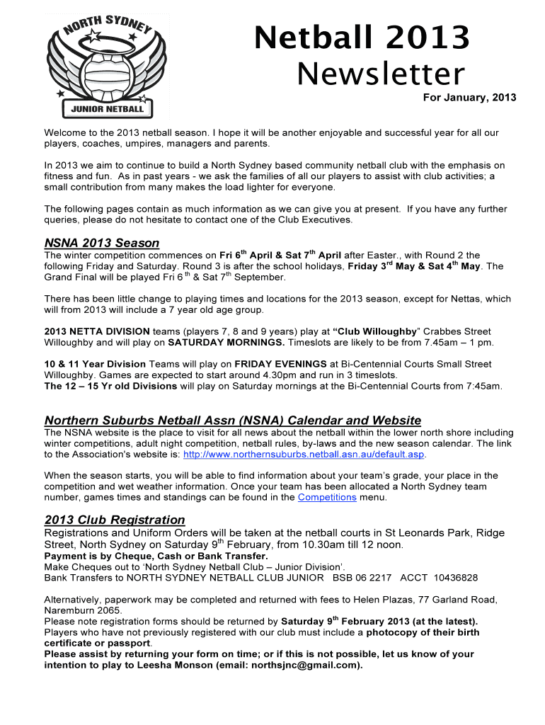 Netball 2013 Newsletter For January 2013 Welcome to the 2013 netball season. I hope it will be another enjoyable and successful year for all our players, coaches, umpires, managers and parents. In