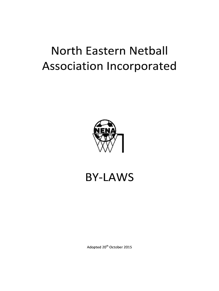 North Eastern Netball Association IncorporatedBYLAWSAdopted 20th October 2015BYLAW AMENDMENTSAmendments 1.7 1.8 1.11 2 3 3.2 3.3 3.4 3.5 3.6 3.7.1 3.7.2 3.7.3 3.7.4 3.9 4.3 5 5.1 5.2 5.3 5.4 5.5 5.6