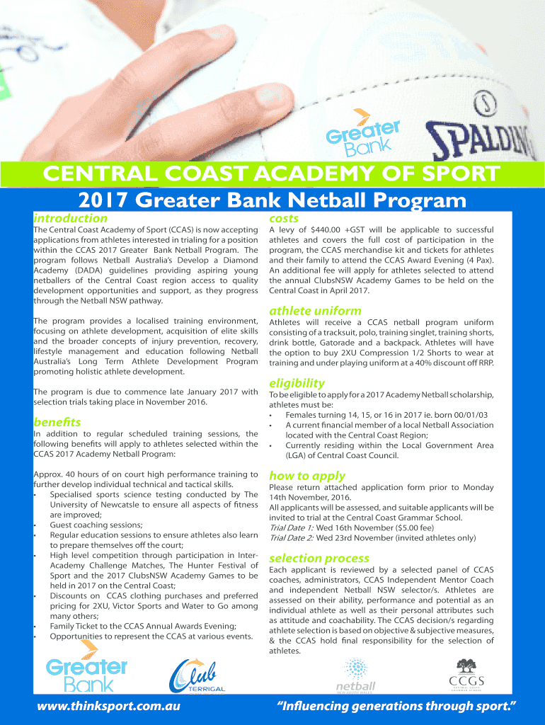 2017 Greater Bank Netball ProgramintroductionThe Central Coast Academy of Sport (CCAS) is now accepting