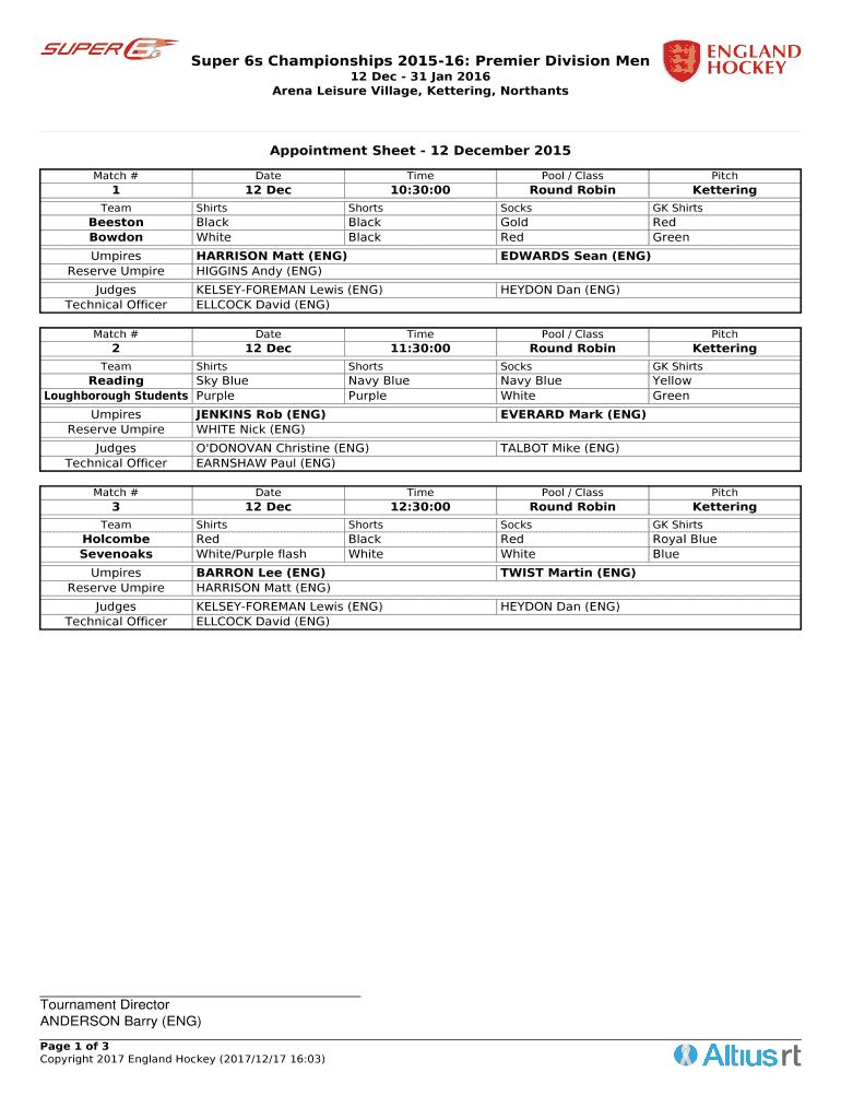 Super 6s Championships 201516: Premier Division Men 12 Dec 31 Jan 2016 Arena Leisure Village, Kettering, NorthantsAppointment Sheet 12 December 2015 Match #DateTimePool / ClassPitch112 Dec10:30:00Round