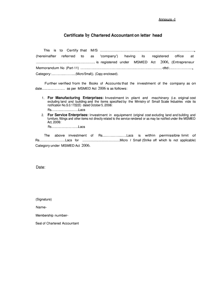Appendix I Certificate by Chartered Accountant on letter head Thesis(hereinaftertoCertify thatreferredtoM/S ......................................................................................................,