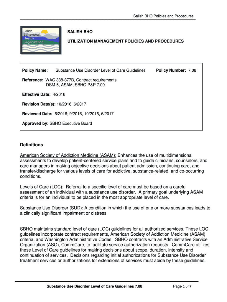 Salish BHO Policies and ProceduresSALISH BHO UTILIZATION MANAGEMENT POLICIES AND PROCEDURESPolicy Name:Substance Use Disorder Level of Care GuidelinesPolicy Number: 7.08Reference: WAC 388877B, Contract