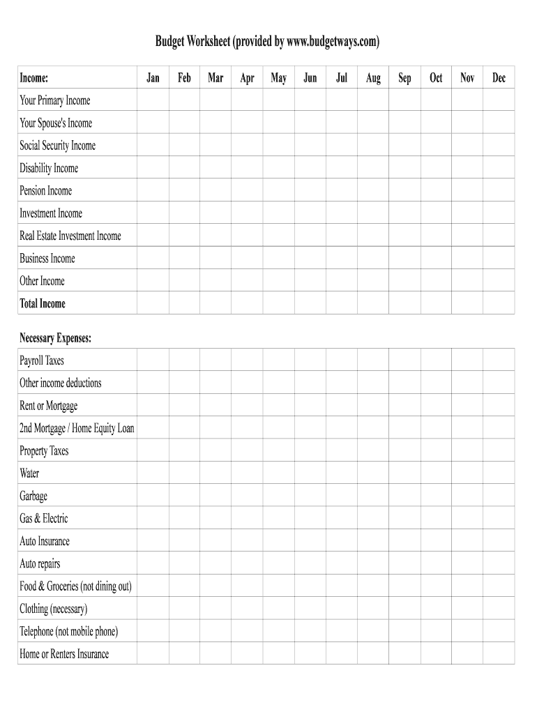 Budget Worksheet (provided by www.budgetways.com) Income: Your Primary Income Your Spouse's Income Social Security Income Disability Income Pension Income Investment Income Real Estate Investment
