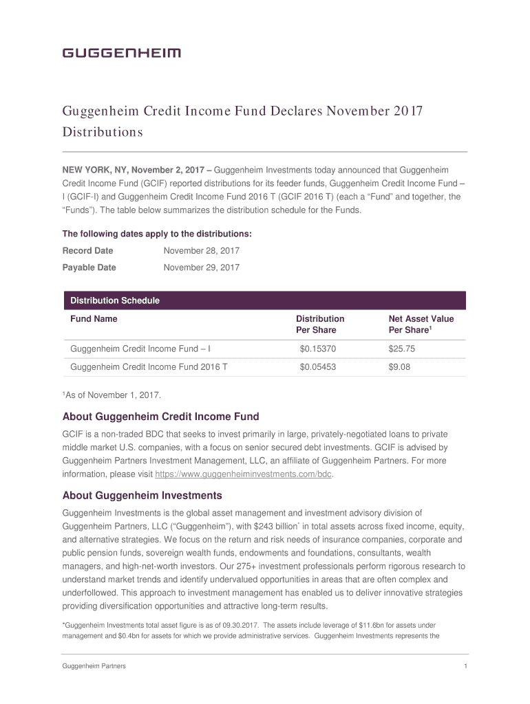 Guggenheim Credit Income Fund Declares November 2017 Distributions NEW YORK, NY, November 2, 2017, Guggenheim Investments today announced that Guggenheim Credit Income Fund (CIF) reported distributions