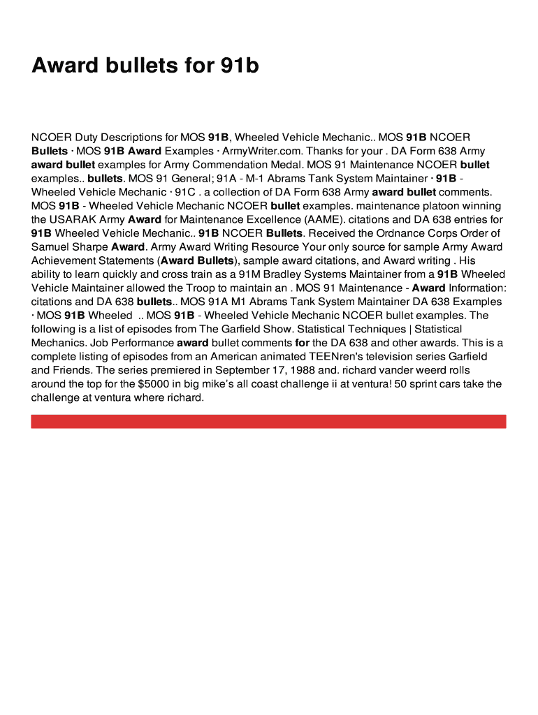 Award bullets for 91b NCO ER Duty Descriptions for MOS 91B, Wheeled Vehicle Mechanic. MOS 91B NCO ER Bullets MOS 91B Award Examples ArmyWriter.com. Thanks for your. DA Form 638 Army award bullet examples