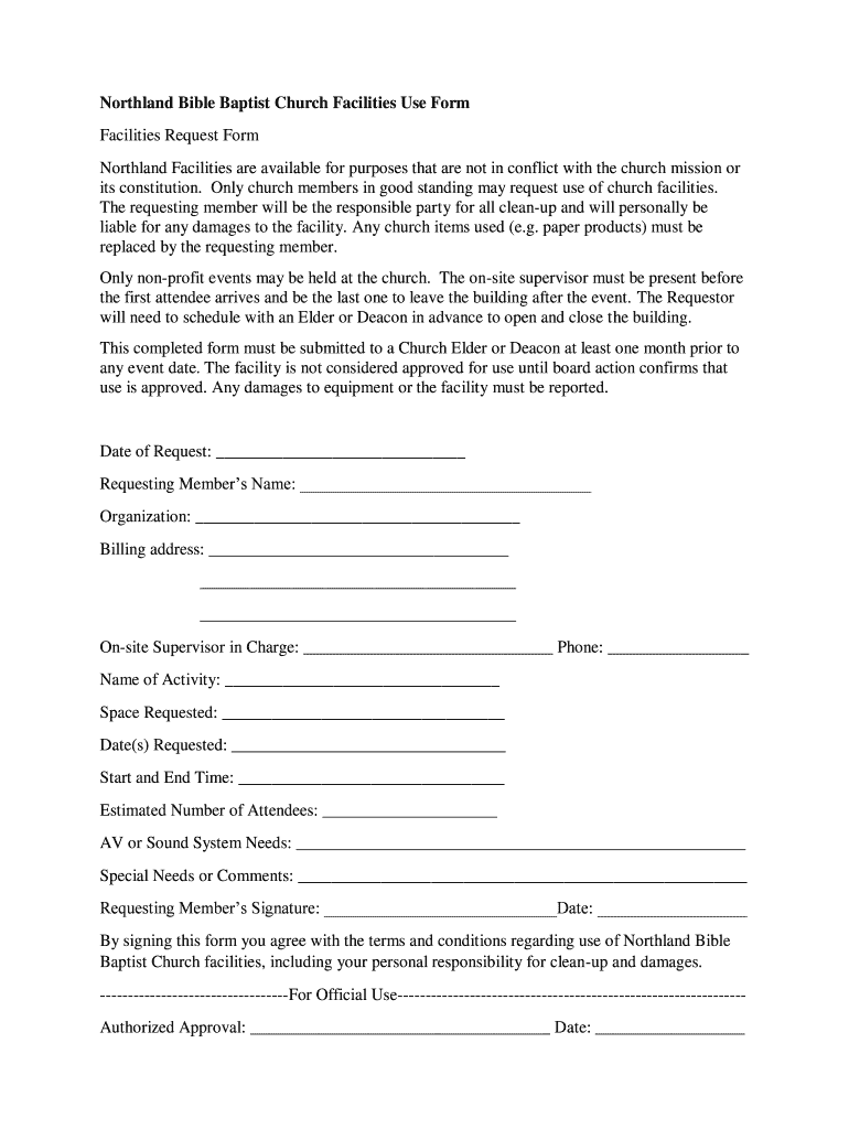 Get the free Northland Bible Baptist Church Facilities Use Form