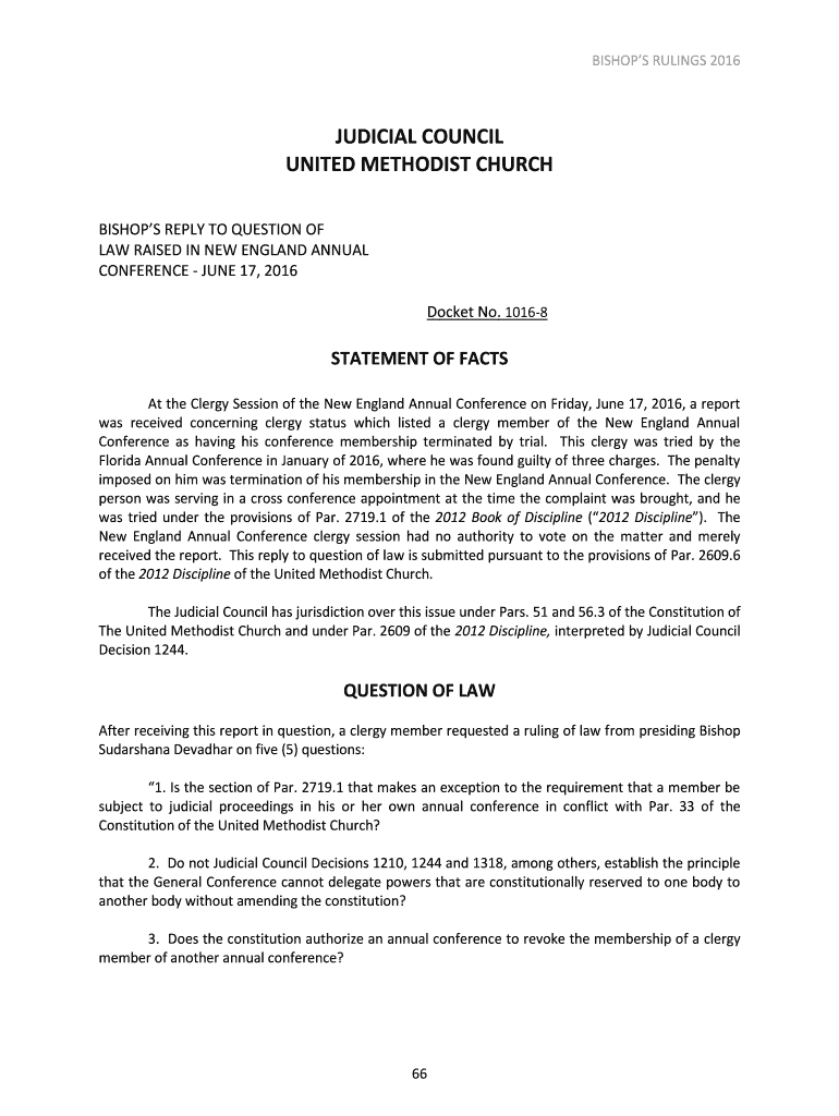 BISHOPS RULINGS 2016JUDICIAL COUNCIL UNITED METHODIST CHURCH BISHOPS REPLY TO QUESTION OF LAW RAISED IN NEW ENGLAND ANNUAL CONFERENCE JUNE 17, 2016, Docket No. 10168STATEMENT OF FACTS At the Clergy