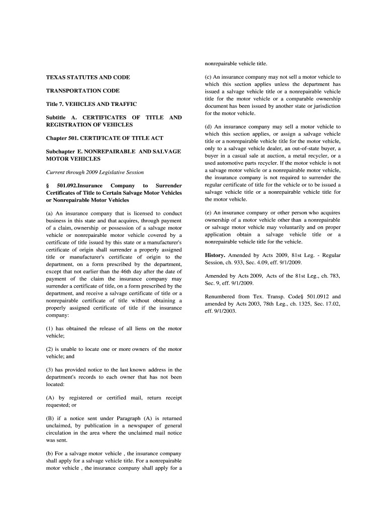 Nonrepairable vehicle title. TEXAS STATUTES AND CODE TRANSPORTATION CODE Title 7. VEHICLES AND TRAFFIC Subtitle A. CERTIFICATES OF TITLE AND REGISTRATION OF VEHICLES Chapter 501. CERTIFICATE OF TITLE
