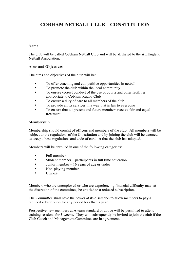 Start by reading the existing constitution of Cobham Netball Club to understand its structure and content.