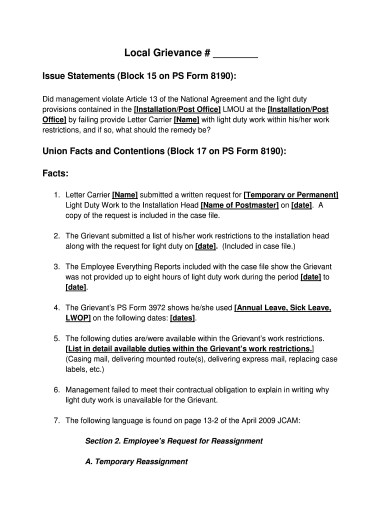 Get the free Local Grievance # Issue Statements (Block 15 on PS Form 8190): Did management violat...
