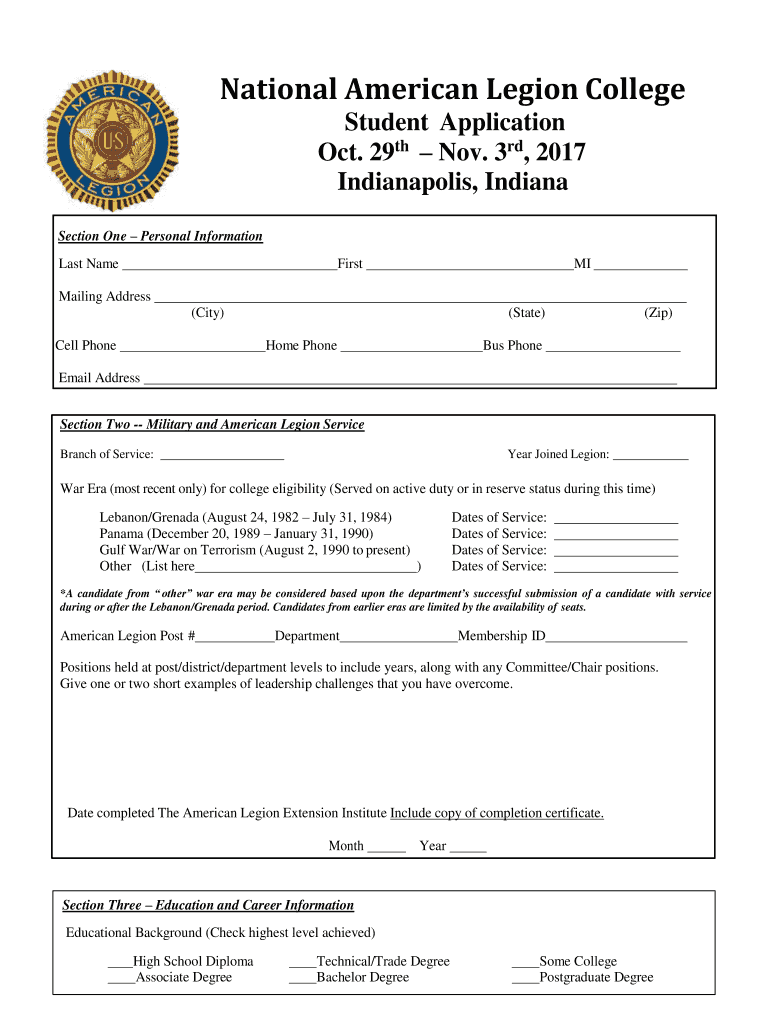 National American Legion College OctoberOfficial Application 29th November3rd, 2017The American Legion National Headquarters Indianapolis, IndianaNational American Legion College Application Completion
