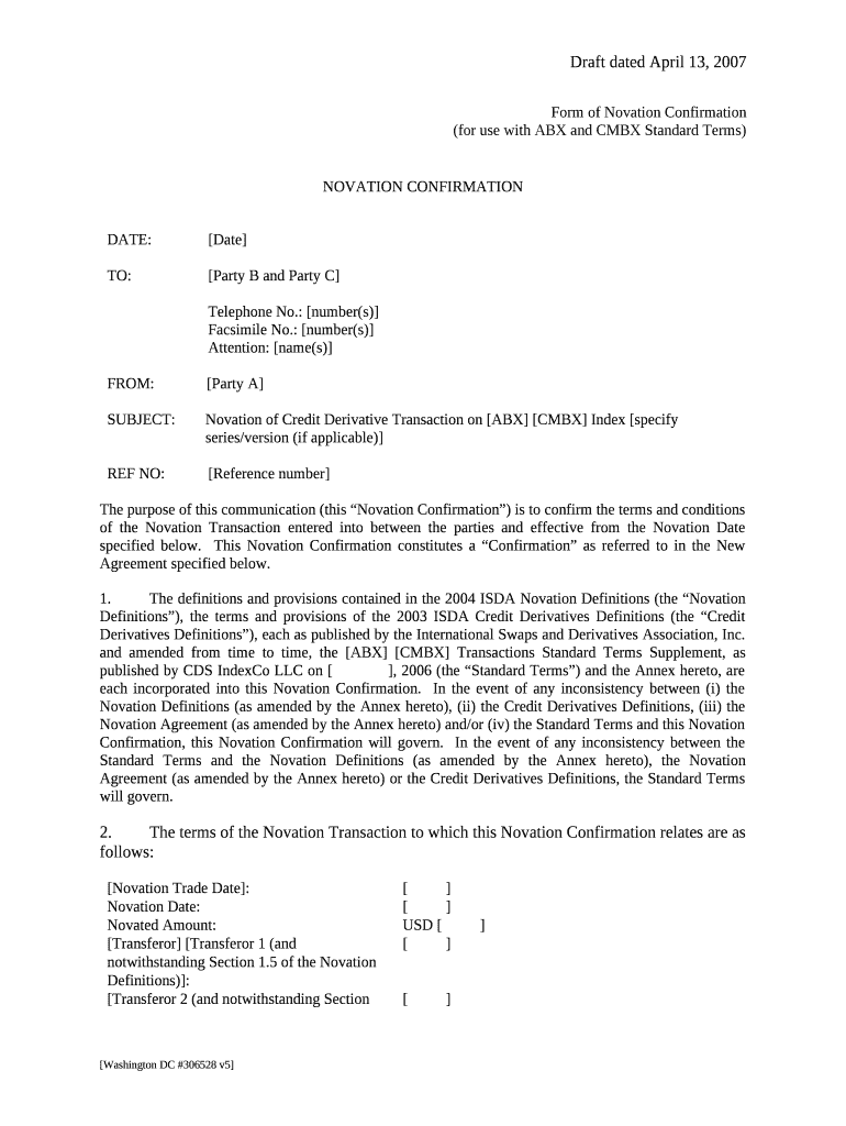 Form of Novation Confirmation (for use with ABX and CMB Standard Terms)NOVATION CONFIRMATIONDATE: Date TO: Party B and Party C Telephone No.: number(s) Facsimile No.: number(s) Attention: name(s)