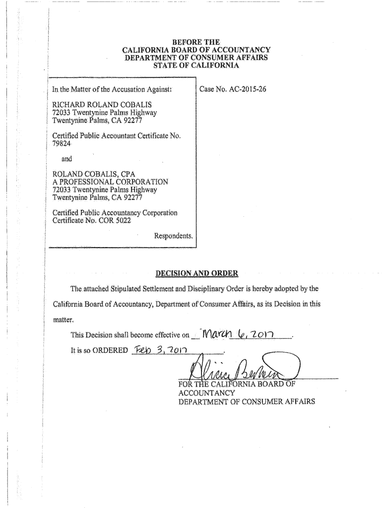 BEFORE THECALIFORNJA BOARD OF ACCOUNTANCY.DEPARTMENT OF CONSUMERiFFAIRS....... STATEOFCALIPORNIA. . In TBT.:Matt:ofthAccusatiott Against: RICHARD ROLAND COB:AXIS 72()33. . INE, alms :way Twenty nine