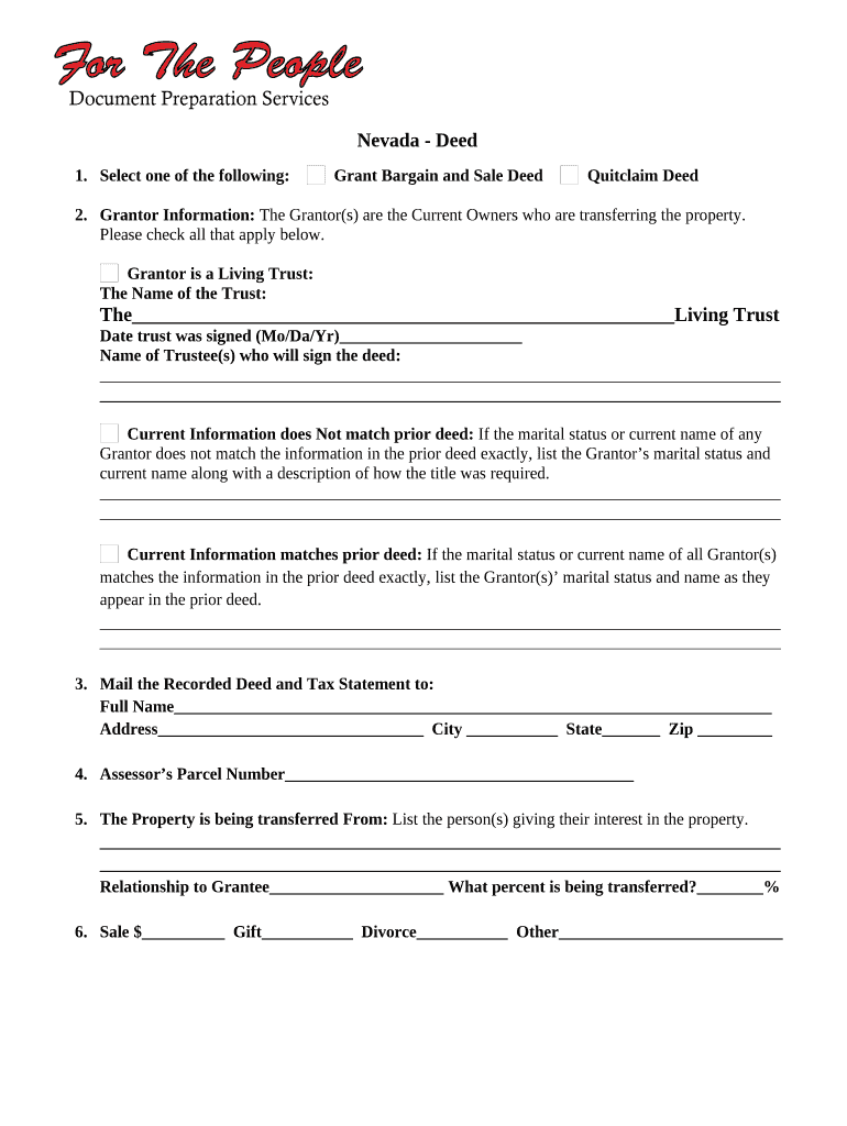 Nevada Deed1. Select one of the following: Grant Bargain and Sale Deed Quitclaim Deed2. Granter Information: The Granter(s) are the Current Owners who are transferring the property. Please check all