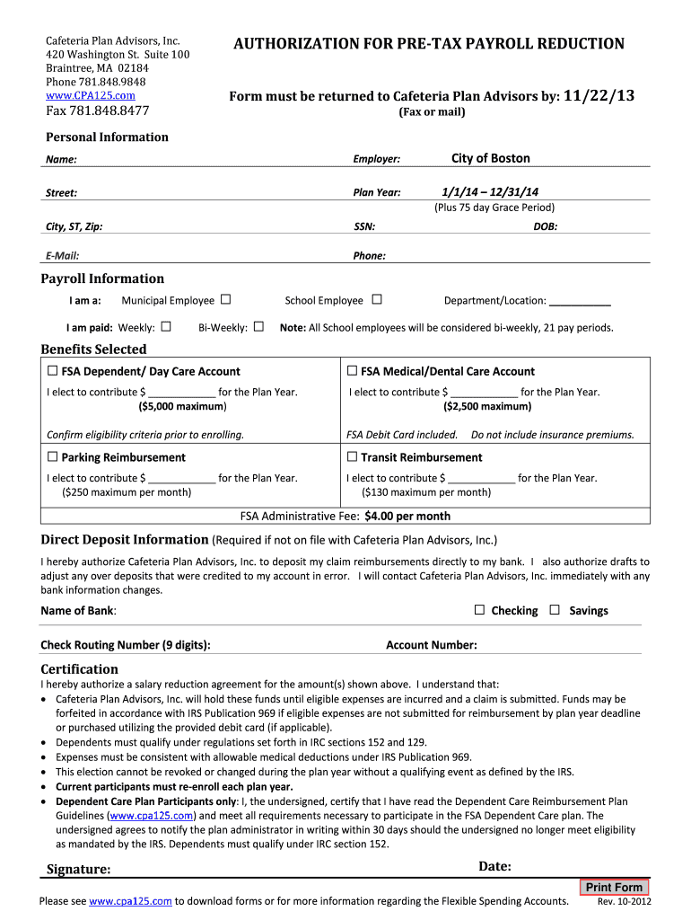 Get the free Cafeteria Plan Advisors, Inc. AUTHORIZATION FOR PRE -TAX ... - cityofboston